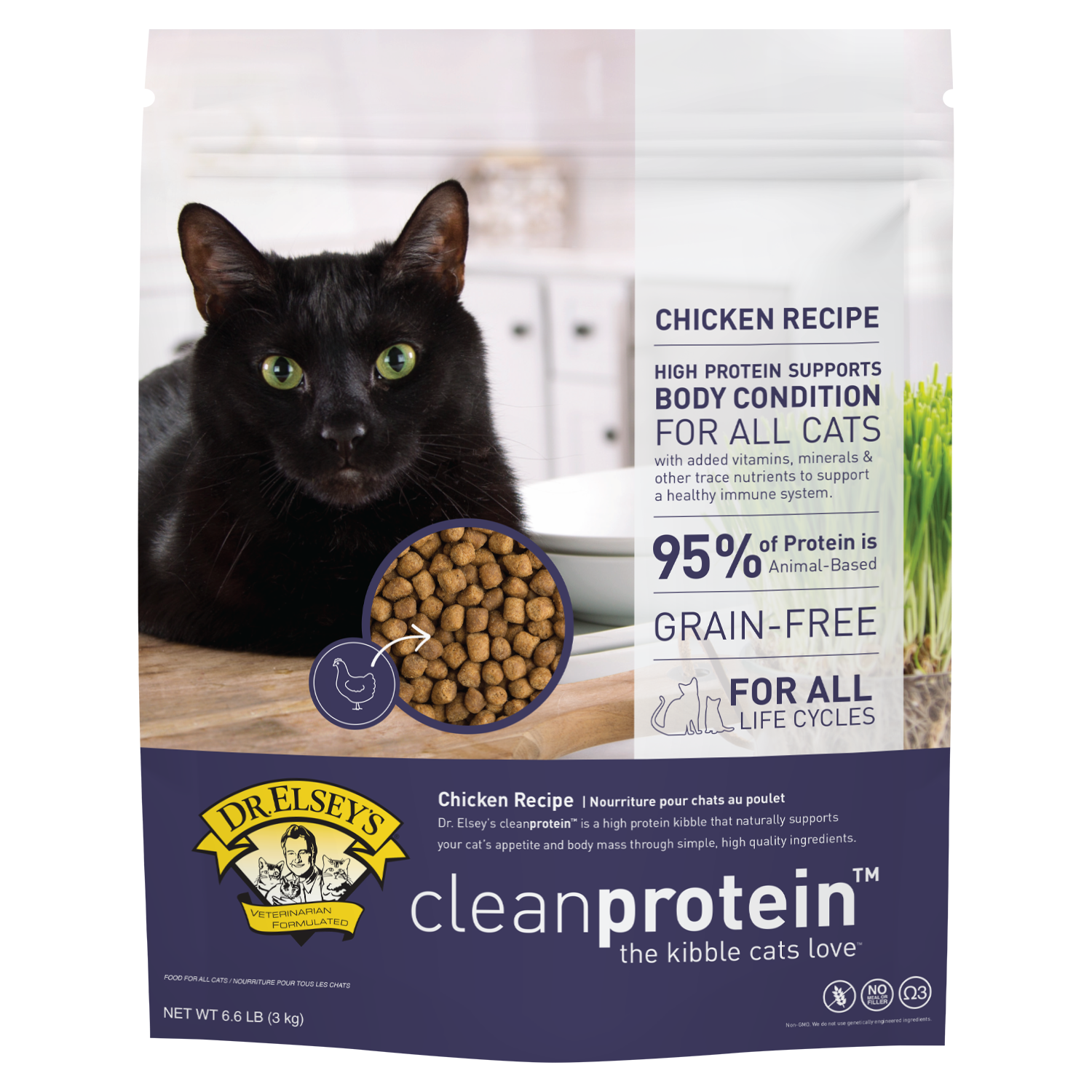 Making the transition from your cat’s current food should be gradual to prevent any digestive upsets. Allow 7-10 days to make the transition by adding a little more Dr. Elsey’s cleanprotein™ each day and decreasing your current cat food. Dr. Elsey’s cleanprotein™ Chicken Recipe is formulated to meet the nutritional levels established by the Association of American Feed Control Officials (AAFCO) Cat Food Nutrient Profiles for all life stages.