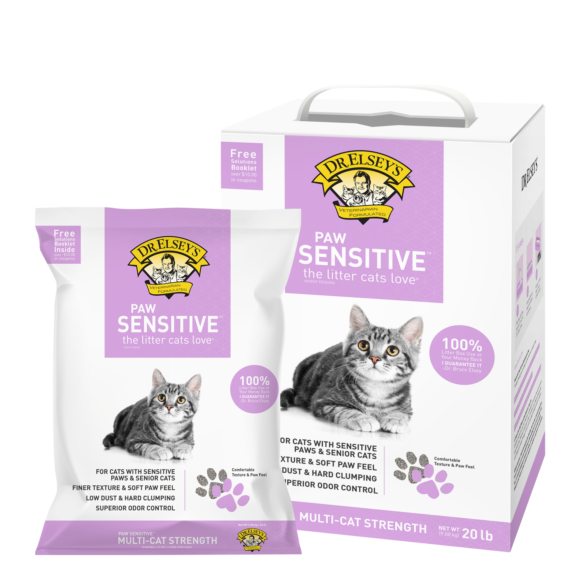 Paw Sensitive™ is a premium scoopable litter with superior clumping ability ground to an ideal granule size to provide a more comfortable texture for a cat’s tender paws. Designed for cats who prefer a softer feel, Paw Sensitive™ is perfect for delicate paws, senior cats and small breeds.