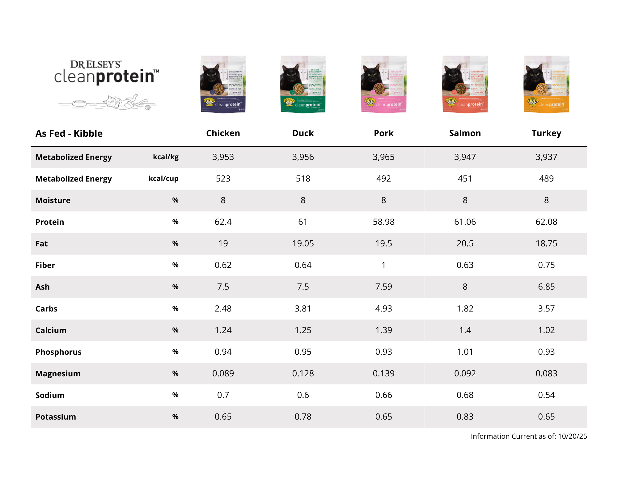 Making the transition from your cat’s current food should be gradual to prevent any digestive upsets. Allow 7-10 days to make the transition by adding a little more Dr. Elsey’s cleanprotein™each day and decreasing your current cat food. Dr. Elsey’s clean protein™Salmon Recipe is formulated to meet the nutritional levels established by the Association of American Feed Control Officials (AAFCO) Cat Food Nutrient Profiles for all life stages.